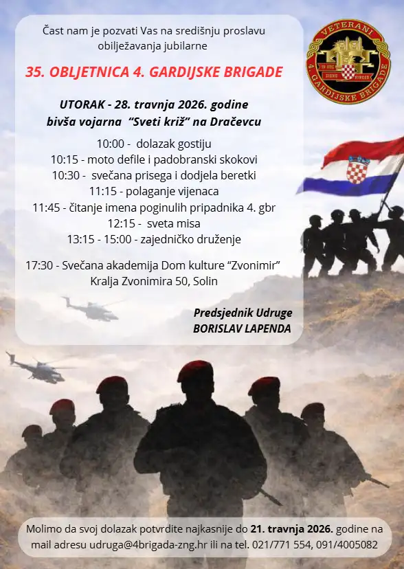 Poštovani članovi, povodom obilježavanja 35. obljetnice naše brigade, s osobitim poštovanjem pozivamo Vas u nedjelju, 26.04.2026. godine, na svečano otvaranje murala posvećenog trojici poginulih ragbijaša Rugby kuba Nada, ujedno i pripadnika 4. gardijske brigade- Zlatku Kavari, Damiru Kroli i Edi Vidakoviću. Okupljanje je predviđeno od 09:00 do 09:45 na Starom placu. Pozivamo Vas da se […]